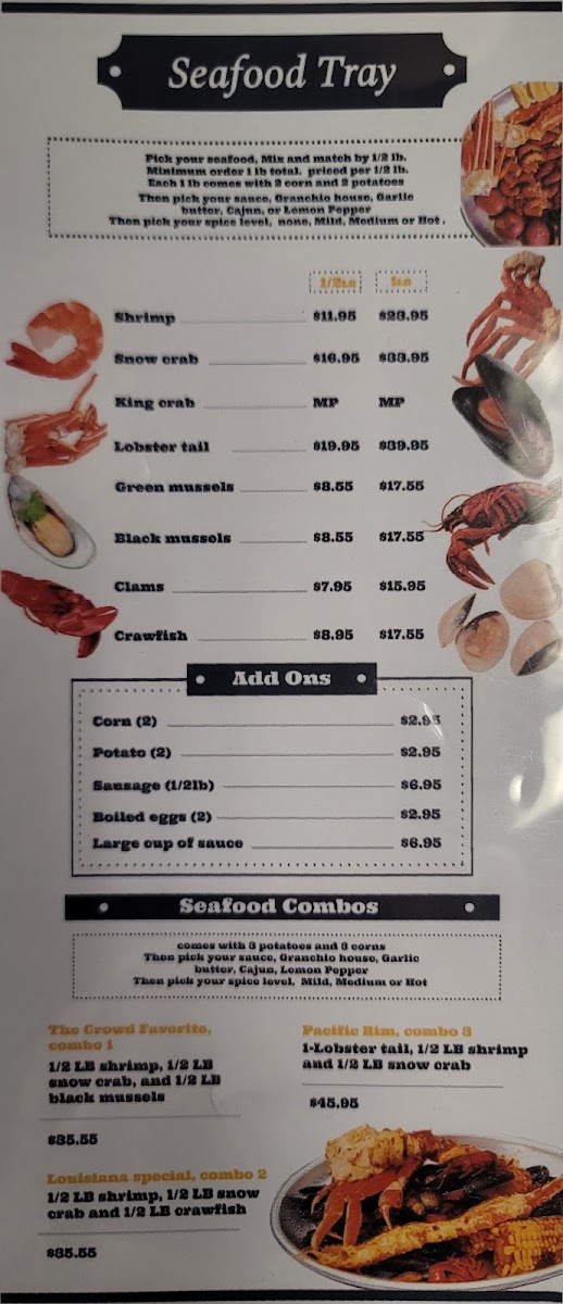 1/2 LB shrimp, 1/2 LB snow crab, and 1/2 LB black mussels Comes with 3 corns and 3 potatoes, Choose you sauce and spice level. No substitutions.