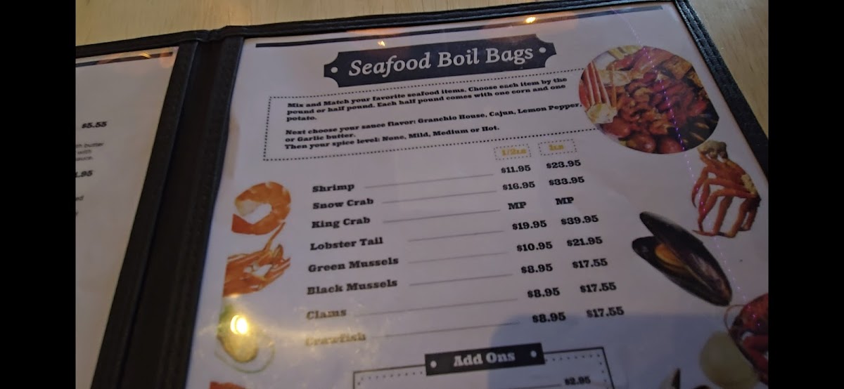 The menu highlights include their enticing Seafood Boil Bag Combos, featuring options like the Pacific Rim Combo and the Crowd Favorite Combo. Each bag is served with an abundance of shrimp, crab, and unique sauces that allow you to customize your spice level.